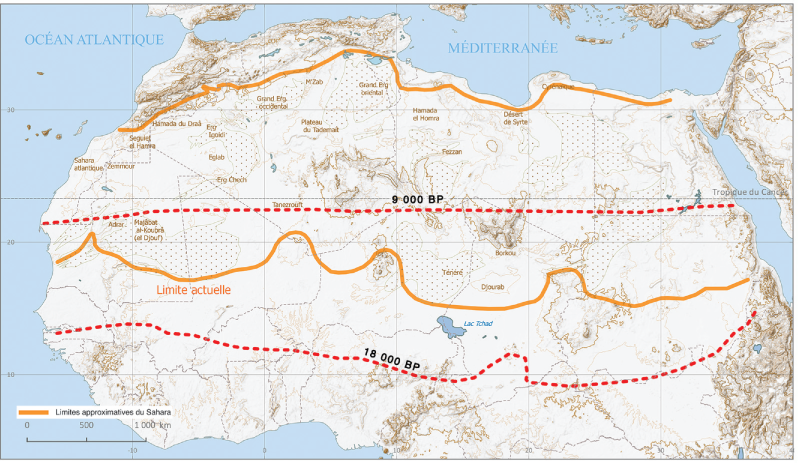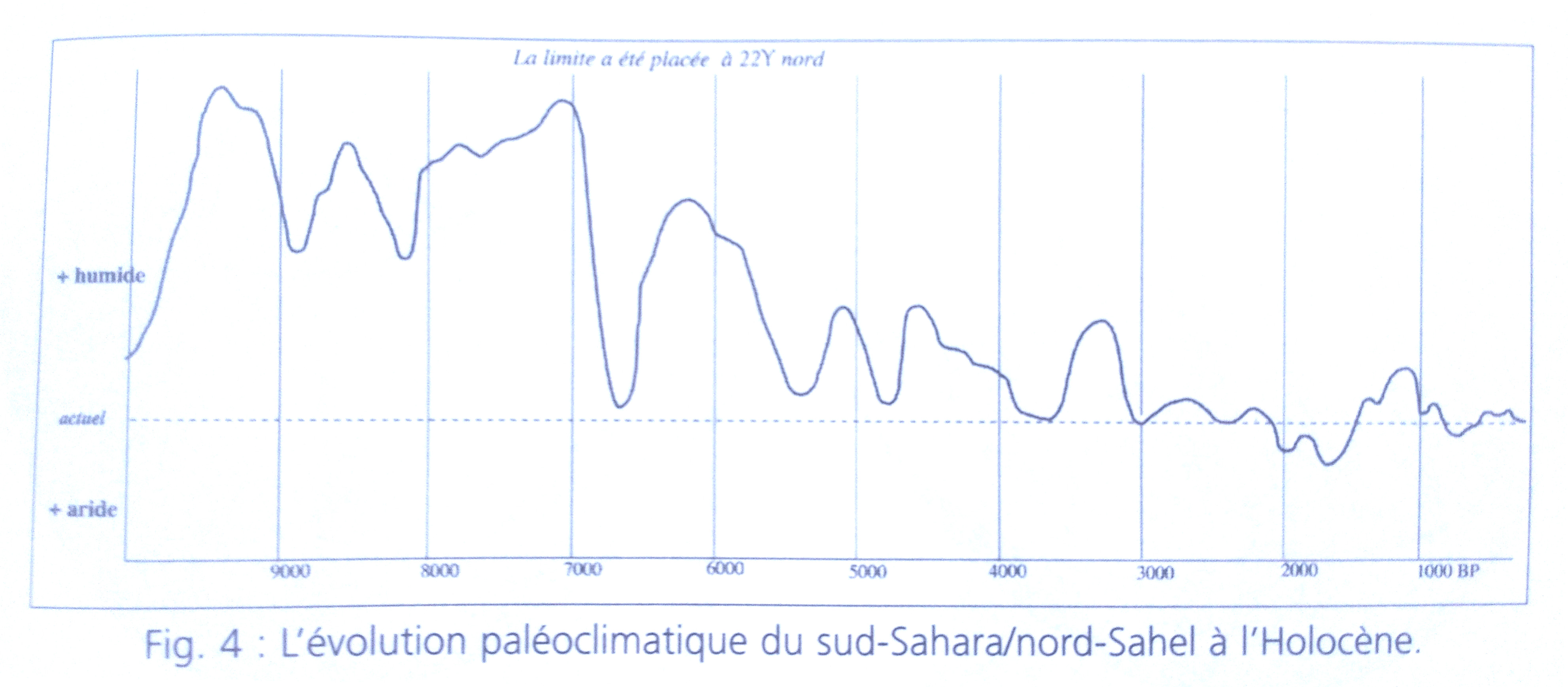 Il y a 3000 ans, la limite nord du Sahel atteint progressivement sa position actuelle à 17°N. Cette évolution climatique dans une zone couvrant environ 6,5 millions de km2 présente des similitudes surprenantes avec celles enregistrées dans la péninsule arabique et en Asie (Yan et Petit-Maire 1994).