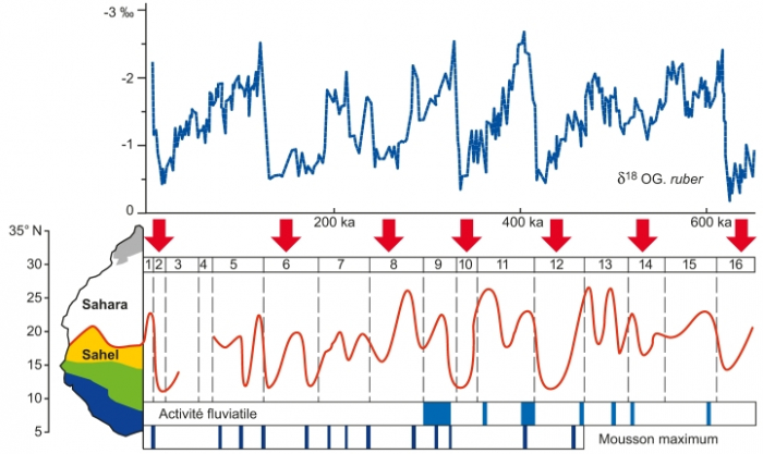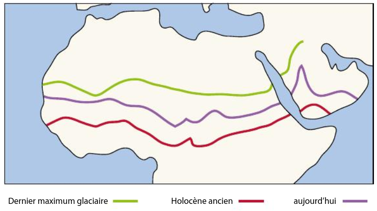 Alors qu'au cours du maximum glaciaire, il y a environ 20 000 ans, durant une période hyper-aride du Sahara, la zone de convergence intertropicale était située à environ 13-14° de latitude nord, lors de l'optimum pluvial il y a 8000 ans, celle-ci remonte vers le nord jusqu'à environ 22-23° de latitude nord, ce qui représente une migration sud-nord d'environ 1000 km entre le dernier maximum glaciaire et l'optimum du grand humide de l'Holocène (Yan et Petit-Maire 1994 ; Caparros 2022).
