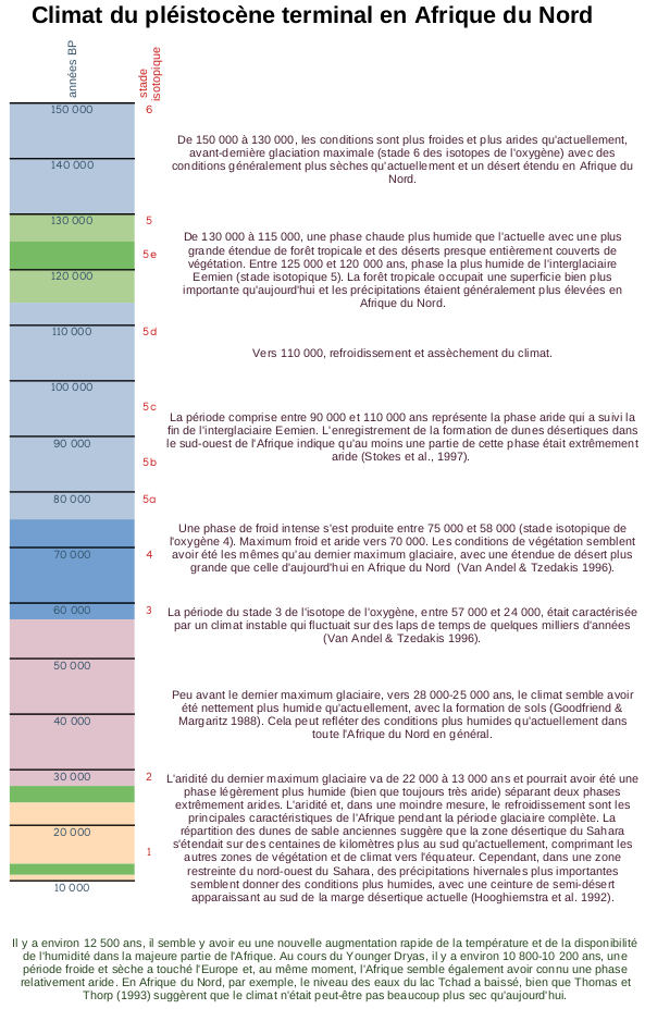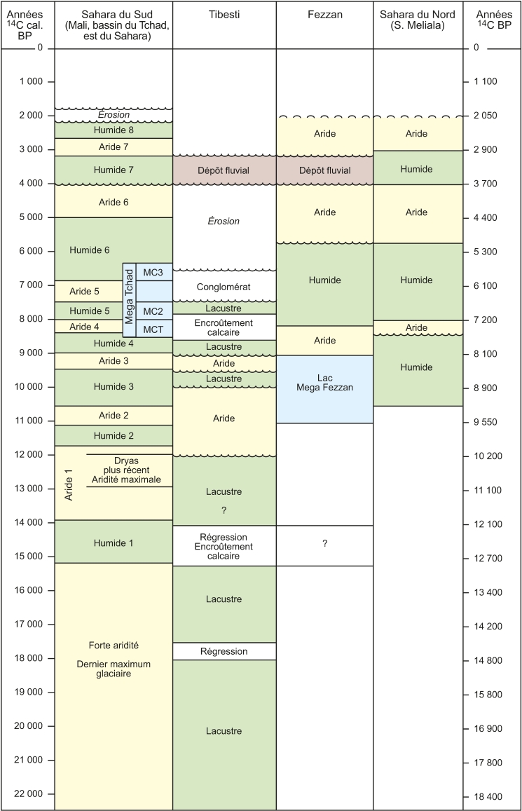 Particulièrement dans le Sahara méridional, à la fois les données stratigraphiques et les datations mettent en évidence des modifications environnementales profondes, mais avec des disparités régionales marquées. Alors que l'on dénombre huit phases humides dans le Sahara méridional, la situation est loin d'être comparable et synchrone avec celle du Sahara septentrional ou oriental, ainsi que des massifs montagneux, offrant ainsi aux populations locales des possibilités de migration à des distances relativement courtes dans des espaces refuges, tels que les régions en altitude.