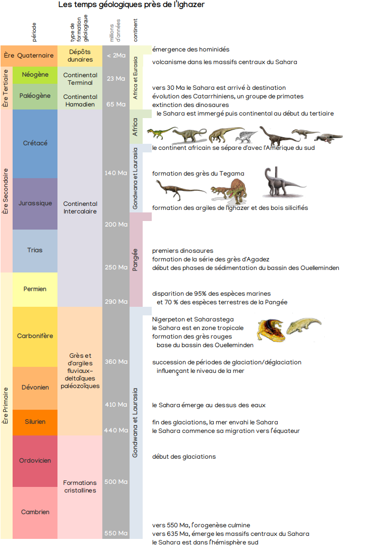 Au Trias (240 Ma), la dérive des continents se poursuit en direction de l'équateur, entraînant des environnements plus humides. C'est l'époque des dinosaures, des crocodiles, des tortues et la formation de la série des grès d'Agadez, qui sépare l'Aïr de l'Ighazer. Au Jurassique (170 Ma), les argiles de l'Ighazer se forment, ainsi que des bois silicifiés qui seront utilisés ultérieurement pour la fabrication d'outils préhistoriques. La plaine de l'Ighazer est alors une forêt peuplée de gigantesques arbres parcourue par des dinosaures. C'est également à cette époque (vers 150 Ma) que les mammifères émergent. Au Crétacé (100 Ma), le continent africain se sépare de l'Amérique du Sud. Il est ensuite immergé à nouveau avant de redevenir continental au début du Tertiaire (66 Ma). C'est également à cette période que survient l'extinction des dinosaures et l'apparition des primates. Le Sahara se rapproche ainsi de sa destination finale.