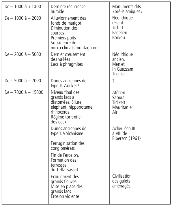 A partir de 2500 BCE, le processus d'aridification du Sahel et du Sahara est en place, et le climat évolue lentement vers l'actuel jusque vers le début de l'ère chrétienne. Ce climat de mousson avec une saison sèche de plus en plus marquée va repousser les populations autochtones soudanaises, d'abord aux abords des grands fleuves fossiles, Ighazer et Azawagh, puis vers le sud laissant ainsi la place ou se mêlant à de nouvelles populations nomades, des paléoberbères mieux adaptés à ce nouvel environnement, venus du nord du Sahara vers 2000 BCE.