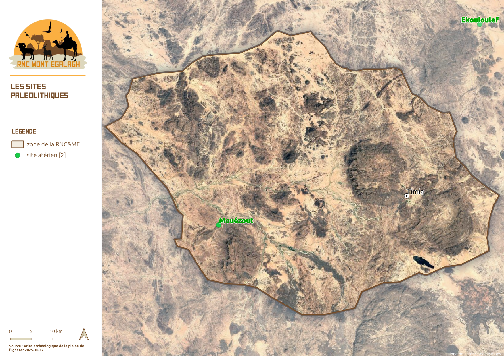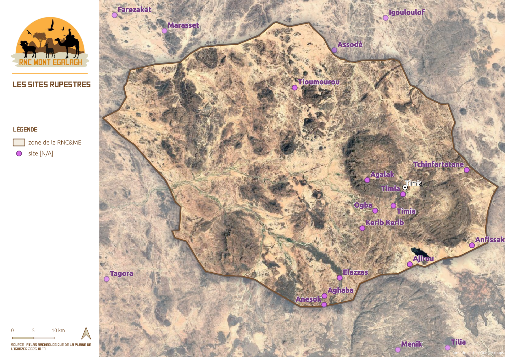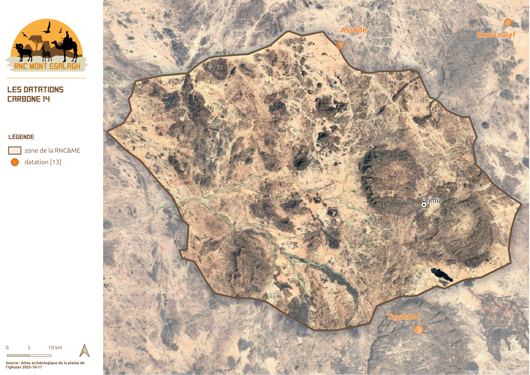 La Réserve Naturelle Communale du Mont Egalagh représente un cadre réglementaire et administratif parfaitement adapté à la préservation du patrimoine culturel et archéologique de l’Aïr. Elle constitue une entité homogène au cœur du massif, abritant l’essentiel des éléments préhistoriques et historiques encore trop peu explorés dans cette région. Cette réserve pourrait ainsi devenir un socle pour des programmes de recherche préhistorique et historique, visant à approfondir l’étude de vestiges archéologiques encore largement méconnus. Ce document en est une des premières pierre.