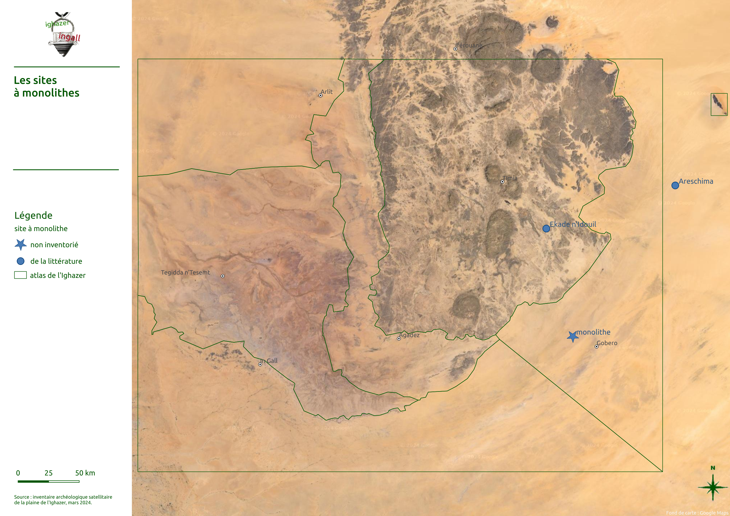 Également en Aïr oriental, on retrouve un tel monolithe réutilisé dans une mosquée à Ekad ou servant de mirhab pour des mosquée de plein air. Enfin, Mauny citant Bouesnard nous rapporte également dans cette même zone, des cercles de monolithes de 1,50 à 3 mètres par exemple dans la vallée de Tafidet (Mauny 1976).