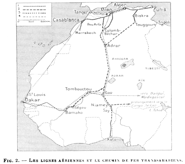 La traversée su Sahara se fait en suivant les repères topographiques ainsi que les pistes qui commencent à se dessiner après les passages répétés des automobiles. Les balisages des routes, bidons et autres tas de pierres, vont servir également pour les avions tout comme les stations essence Shell qui ravitaillent les engins à moteur. Les premiers carnets de vol seront édités en 1935 par Shell et toutes les bonnes revues de mécanique saharienne. Les vols qui passent en Ighazer partent d'In Guezzam, se dirigent sur In Abangarit puis Tegidda n'Tesemt, In Gall et enfin Agadez, une étape de 4h30 environ. La poursuite de l'itinéraire se fait en direction de Zinder et Kano en passant par les falaises de Tiguidit et le puits d'Abalemma.
